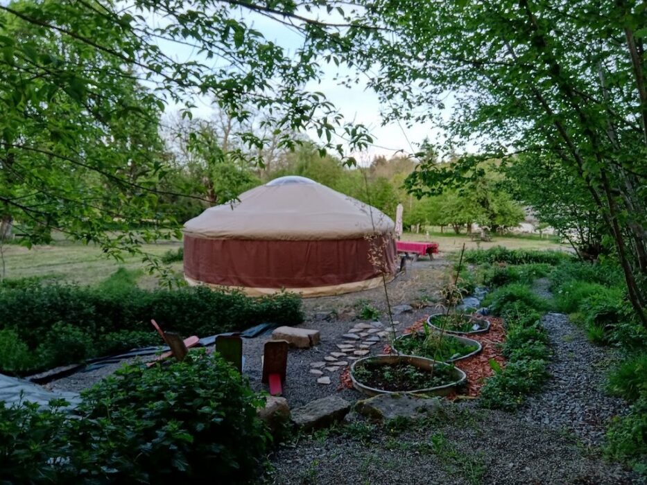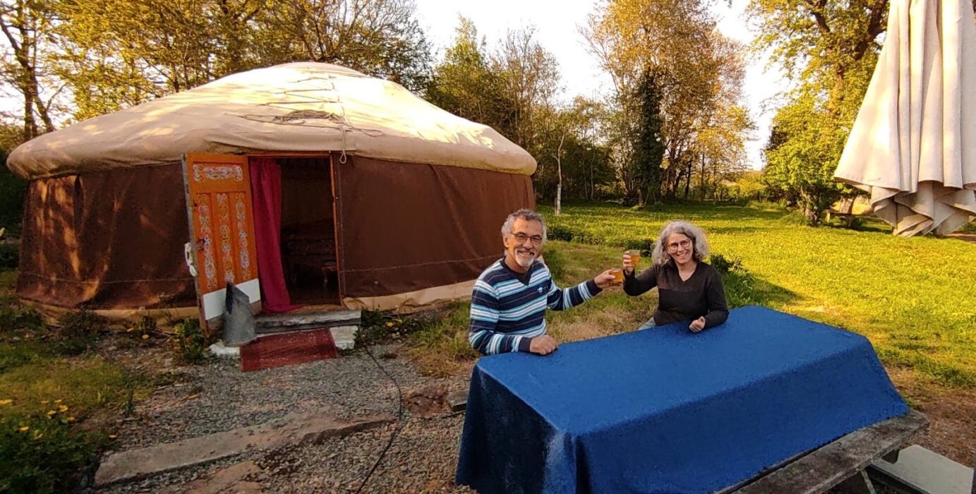 "Nous avons une conception simple de la vie et nous vous accueillons simplement ! Une toute petite ferme biologique de 3 ha (abritant 2 ânes, 3 vaches, 1 chèvre, quelques poules et Nacou notre chienne), un espace naturel (herbage, haies, fruitiers jeunes et anciens), un petit camping paysan de 6 emplacements, 2 yourtes, équipés sobrement, avec des aménagements volontairement rustiques, propres, fabriqués de matériaux bruts, meublés avec des objets de seconde vie. Notre priorité tient en deux points essentiels : le respect de l’espace naturel et la création de liens humains."
