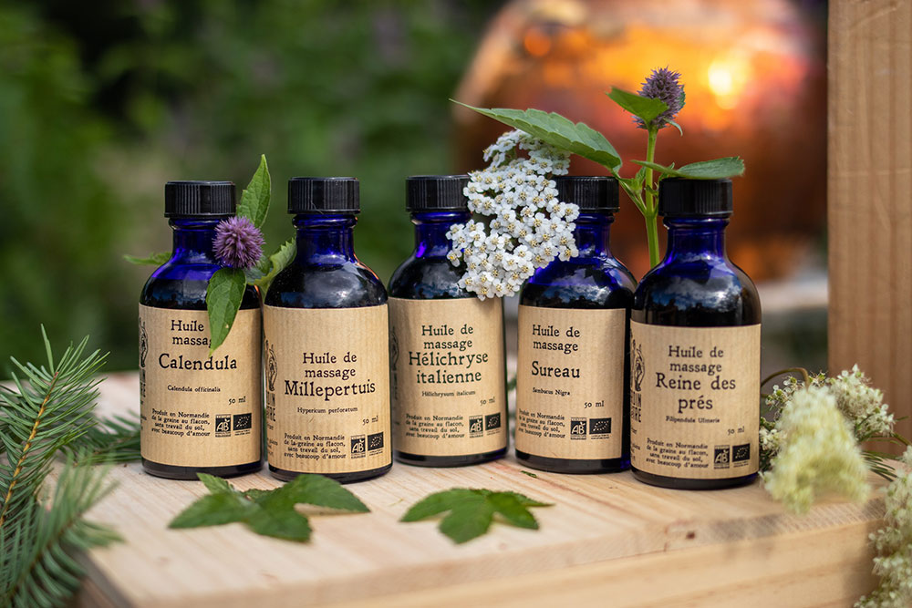 Je produis et cueille dans les environs des plantes aromatiques et médicinales certifiées biologiques. Je les distille pour en faire des hydrolats que vous pourrez utiliser aussi bien par voie externe que par voie interne, notamment pour des cures. Je fais également macérer une partie de mes cueillettes pour en faire des huiles de massages. Vous pouvez retrouver mes produits dans des épiceries environnantes ainsi que sur les marchés de Ségrie-Fontaine et de La Carneille, ou directement au jardin sur rendez-vous. Je propose également des massages relaxants (corps entier) avec mes macérâts huileux. Cela permet de libérer les tensions accumulées et d'aller vers le bien-être. Je propose aussi des séances de Chi Nei Tsang, massage taoïste des organes internes. Il permet une relaxation profonde et rééquilibre les émotions, notamment en favorisant la circulation lymphatique et énergétique.